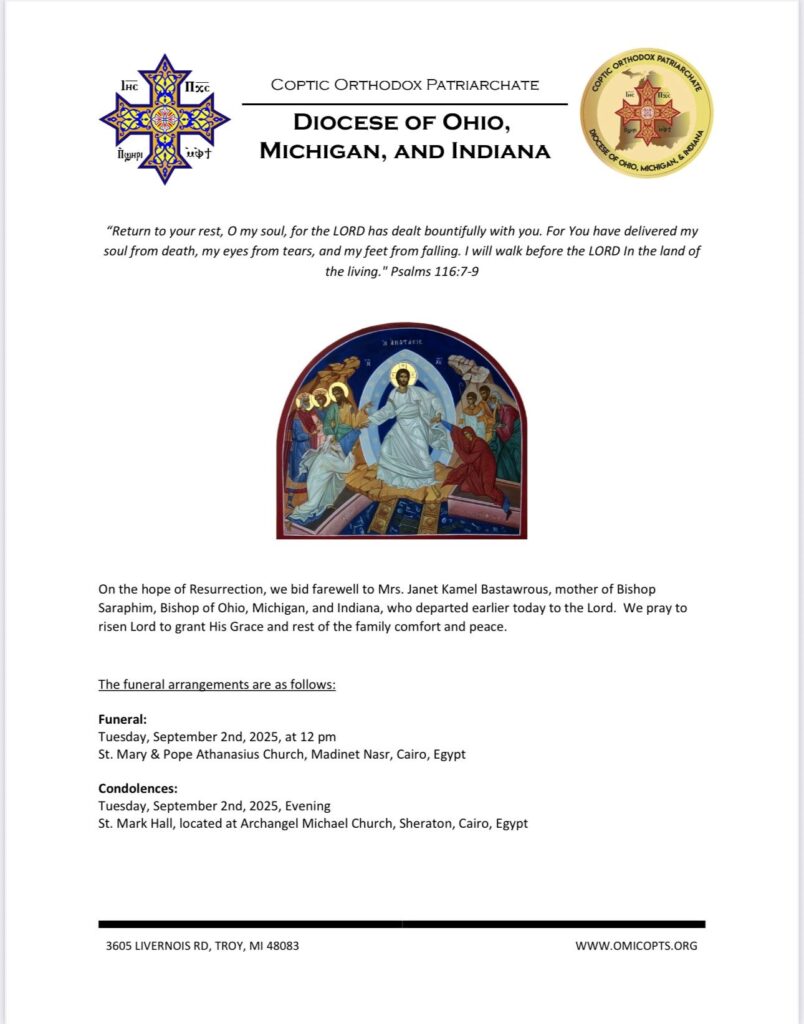 On the hope of Resurrection, we bid farewell to Mrs. Janet Kamel Bastawrous, mother of Bishop Saraphim, Bishop of Ohio, Michigan, and Indiana, who departed earlier today to the Lord. We pray to risen Lord to grant His Grace and rest of the family comfort and peace.